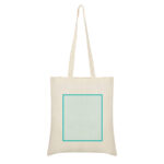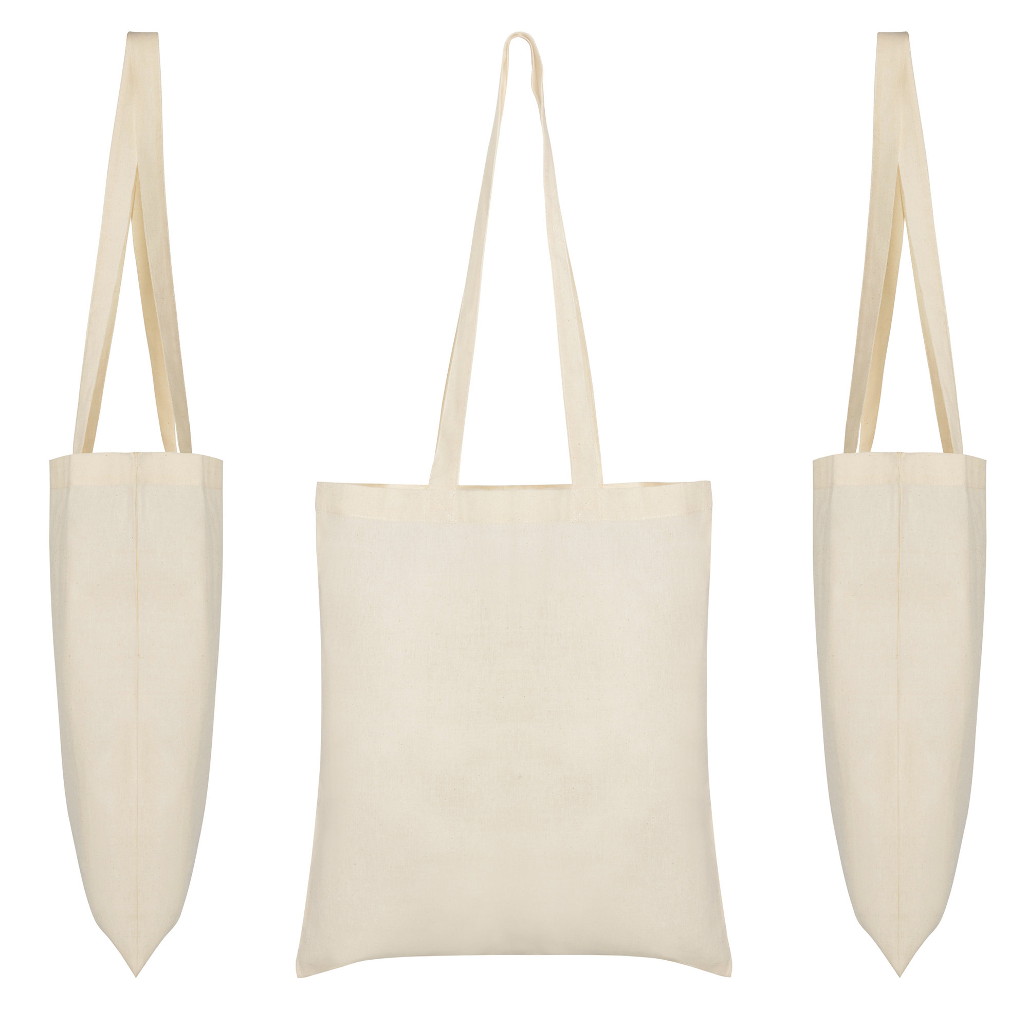 Bolsa confeccionada en algodón de 140 g/m² en tono natural, equipada con asas largas de cinta a juego, pensadas para un uso cómodo y práctico.