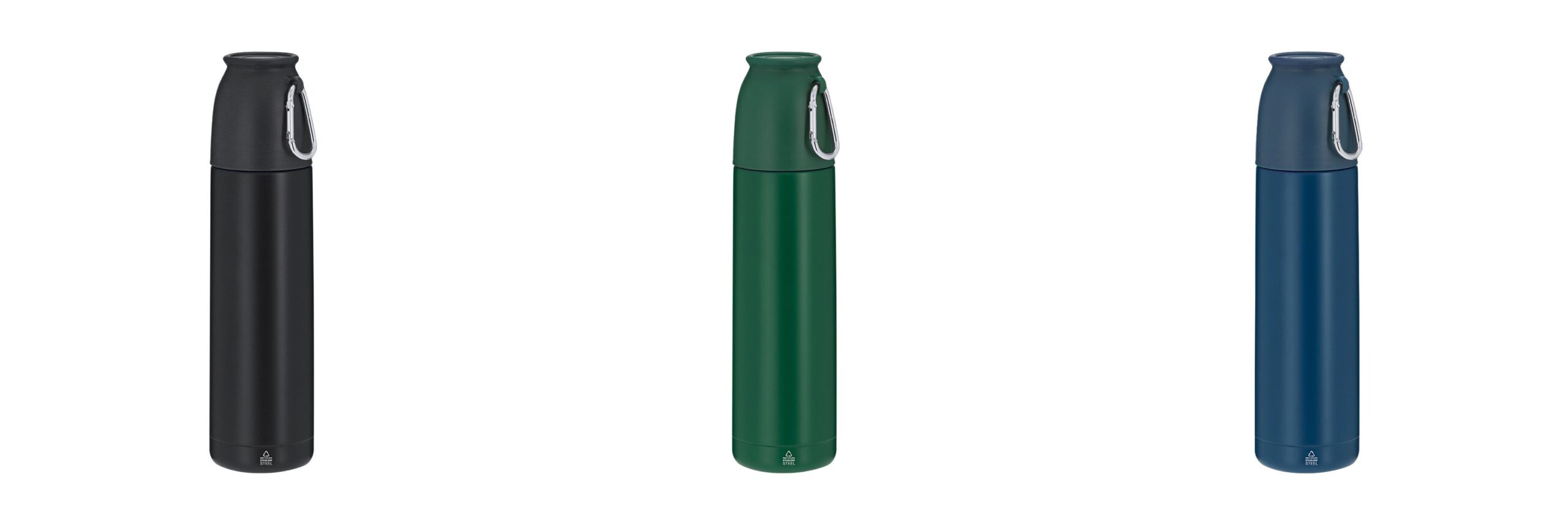 Set de termo con taza en acero inoxidable reciclado, con acabado mate a juego. Incluye un termo de 500 ml de doble pared para una óptima conservación de la temperatura y taza de 120 ml ajustable por rosca, con mosquetón para fácil transporte. Diseño sostenible y reutilizable, con distintivo de Acero Inox Reciclado.