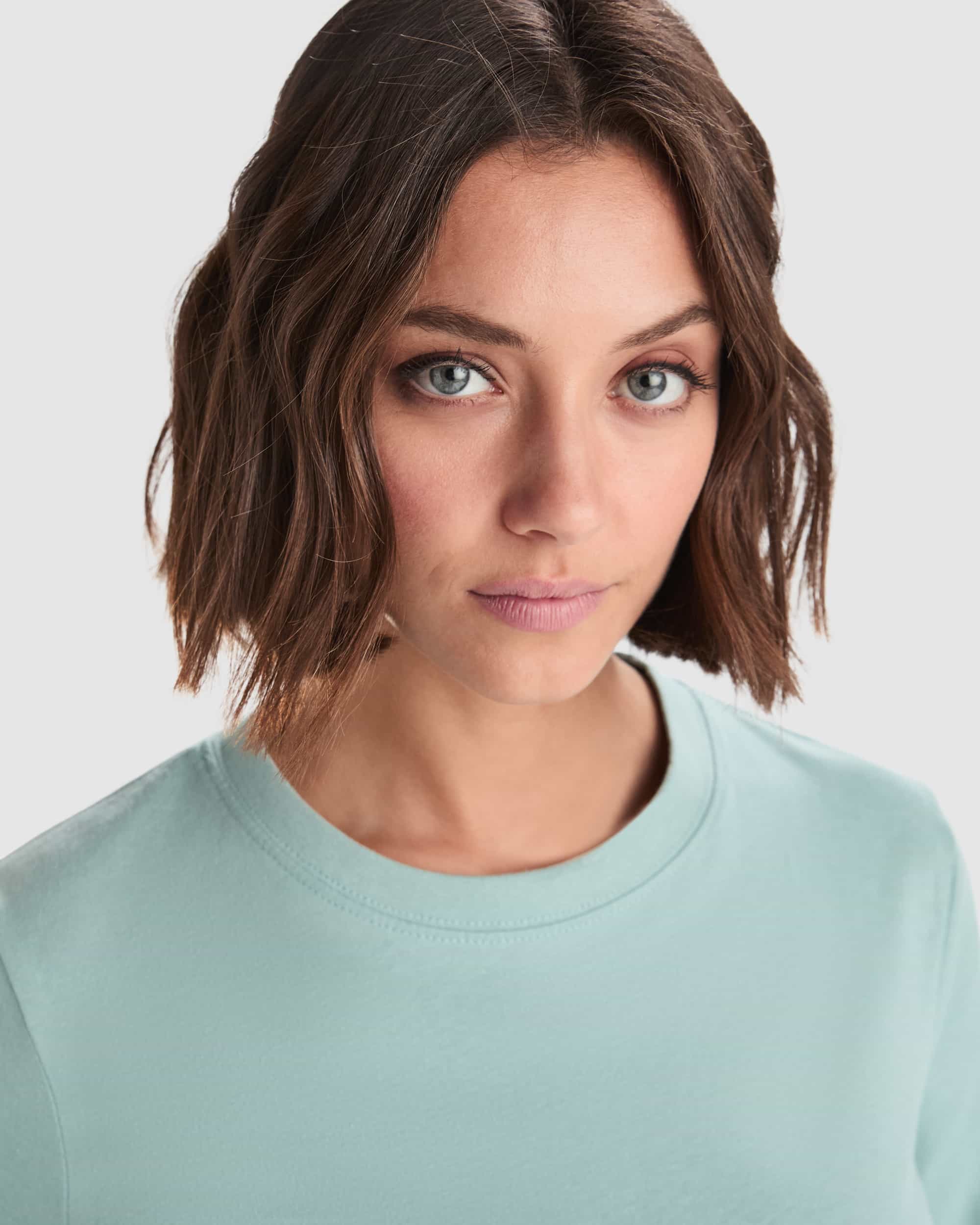 Camiseta manga corta con talle corto y holgado. Cuello redondo en canalé 1×1 ancho. Cubrecosturas en cuello del mismo tejido.