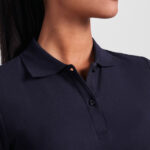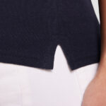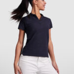 Polo de mujer entallado de manga corta en algodón orgánico certificado OCS. Cuello y ribete de mangas en canalé 1×1. Tapeta con 2 botones. Cubrecosturas reforzado en cuello. Aperturas laterales en el bajo.
