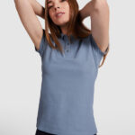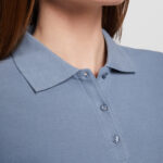 Polo de mujer de manga corta. Cubrecosturas reforzado en el interior del cuello. Cuello y ribete de manga acanalado. Costuras laterales y corte ajustado. Tapeta fina con tres botones. Aperturas en los laterales del bajo.